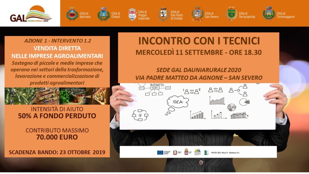 L’incontro si svolgerà mercoledì 11 settembre alle 18.30 presso la sede del Gal Daunia Rurale 2020 in via Padre Matteo da Agnone a San Severo)